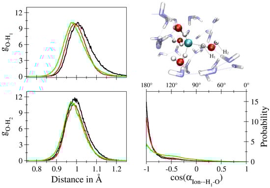 Oxygen-hydrogen radial distribution function of water molecules in the first solvation shell of aqueous F (black), Cl (red) and Br (green) separated into contributions of the H-atoms in proximal (H, top left) and distal (H, bottom left) position with respect to the solute along with the associated ion⋯H–O cosine distribution function (bottom right). The screenshot of aqueous F displays the assignment of H and H for an exemplary first shell water molecule, that is re-evaluated in every simulation step.