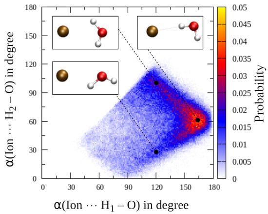 Two-dimensional histogram correlating the ion⋯H–O and ion⋯H–O angles registered for each first shell ligand of Br obtained from the QM/MM MD simulation.