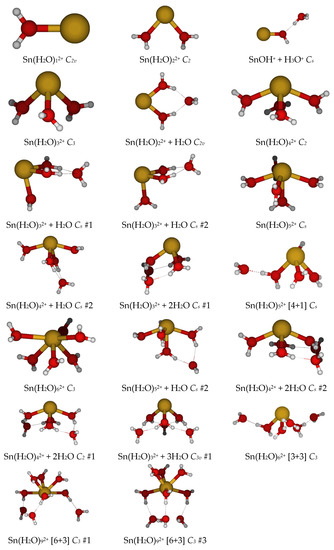 Calculations were performed using Gaussian 98 [12]. This program version was the first to allow the analytical frequency calculation of molecules in which core electrons are described by effective core potentials (ECPs), and thus, many variants of these were tried. The MP2 calculations use the frozen core approximation. A stepping-stone approach was used for geometry optimization, in which the geometries at the levels HF/CEP-4G, HF/CEP-31G*, HF/CEP-121G*, HF/LANL2MB, HF/LANL2DZ, and HF/SDD were sequentially optimized. For minimum energy structures, the MP2/CEP-31G* and MP2/CEP-121G* calculations were also performed. Calculations were also carried out using the 6-31G* and 6-31+G* basis sets on the atoms of the water molecules (5d) with an effective core potential and basis set on the metal ion (denoted as ECP+6-31G* or 6-31+G*). For shorthand, we denoted the mixed basis sets as follows: CEP-121G* on Sn and 6-31G* on O, H, as basis set A; LANL2DZ on Sn and 6-31G* on O, H, as basis set B; and SDD on Sn and 6-31G* on O, H, as basis set C. The corresponding basis sets with diffuse functions were indicated by adding a “+” to the basis set name. Default optimization specifications were normally used. After each level, where possible, a frequency calculation was performed at the same level, and the resulting Hessian was used in the following optimization. Z-matrix coordinates constrained to the appropriate symmetry were used as required to speed up the optimizations. Since frequency calculations are done at each level, any problems with the Z-matrix coordinates would manifest themselves by giving imaginary frequencies corresponding to modes orthogonal to the spanned Z-matrix space. The Hessian was evaluated at the first geometry (opt = CalcFC) for the first level in a series in order to aid geometry convergence. We note that, for the heavy elements only, the three different CEP basis sets are equivalent (CEP-121G*) but differ for the oxygen and hydrogen atoms. We also note that the choice of core electrons defining the pseudopotential depends on the specific core potential (CEP and LANL2, [Kr]4d10; SDD, [Ar]3d10). In some cases, Gaussian 03 [13] and Gaussian 16 [14] were used to correct errors and omissions.