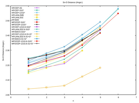 The dependence of the average Sn–O distance on the coordination number n and level of theory.