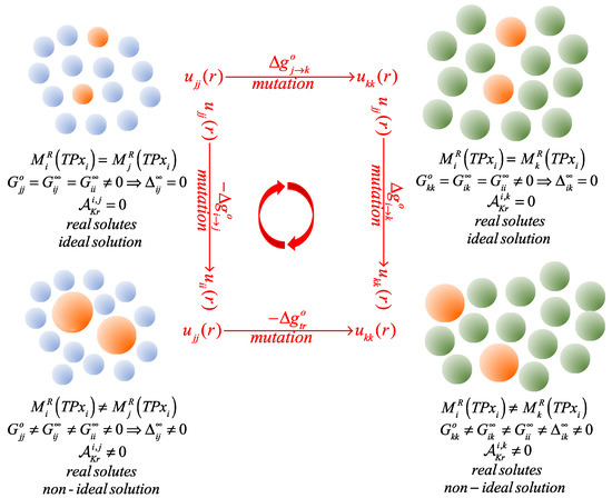Then, the Ni solute-labeled molecules undergo an alchemical mutation process (à la Kirkwood’s coupling-parameter charging) [27] in which the strength of their intermolecular potential parameters change from the original values of the solvent-solvent to those of the final solute-solute interactions. This step generates the desired non-ideal solution of the infinitely dilute solute in the solvent, and involves the following isothermal-isobaric Gibbs free energy change [28],