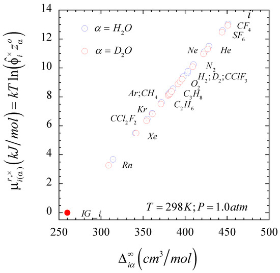 This equation suggests that can be interpreted as a prorated difference of the solute-solvent intermolecular interaction asymmetry function , an observation that we will analyze below. In fact, we should note that the isothermal-isochoric residual chemical potential of the gaseous solutes at infinite dilution in aqueous solutions, , exhibits a linear dependence with the corresponding solute-solvent intermolecular interaction asymmetry function as illustrated in Figure 2 when the solvent is either light or heavy water at ambient conditions. We can also identify at a hypothetical value of the solute-solvent intermolecular interaction asymmetry, i.e., one that differs from the theoretical . The reason for this difference resides in the fact that, as demonstrated in Ref. [51], the second-order expansion cannot provide an accurate description of the behavior of non-interacting solutes, i.e., it requires at least a six-order composition expansion. However, because the condition also means that , we can determine the hypothetical value of so that , where comprises contributions from the first few infinite dilution composition derivatives of the as indicated by Equation S5 in the Supplementary Information document of Ref. [51].