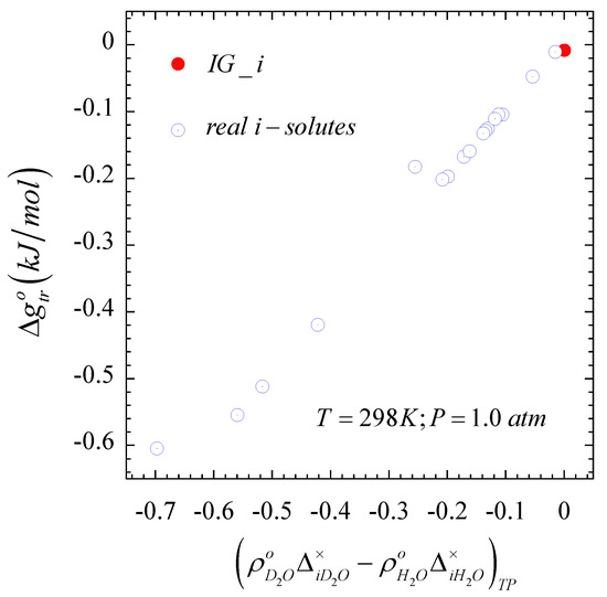 For the implementation of the approach proposed in Section 2.1 and Section 2.2, we proceed with the calculation of the required hydration (solvation) properties as follows. Based on the data of Table 1, we can determine the Gibbs free energy of transfer , Equation (4), in terms of the hydration Gibbs free energy of the solute in the two isotopic forms of the solvent,