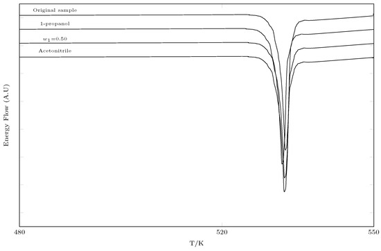An important factor to consider is the possible formation of polymorphs since this phenomenon affects drug solubility [26]. For this purpose, the solid phases of the original sample and the phases in the equilibrium with pure MeCN, pure 1-PrOH, and in the cosolvent mixture were evaluated (Figure 2).