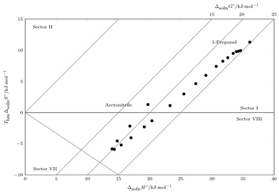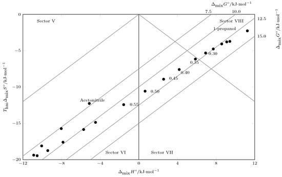 The solution entropy follows a similar pattern as the enthalpy of the solution, decreasing from pure 1-PrOH to and then increasing to pure MeCN. Finally, when analyzing the solution enthalpy and entropy contribution to the Gibbs energy, the energetic component, i.e., the solution enthalpy, is the main source (>71%). This was verified by Perlovich’s analysis (Figure 3) since when plotting vs. , all of the values were recorded in the sector I ( > ) and the sector VIII (, , > ), indicating an enthalpic conduction of the dissolution process [44,45].