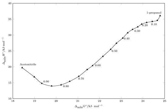 The enthalpy–entropy compensation can be evaluated through two graphic models: (i) vs. , where negative slopes indicate entropic driving and positive slopes enthalpy driving; and (ii) vs. , where slopes >1.0 indicate enthalpy driving and slopes <1.0 indicate entropic driving. Hence, according to Figure 5 and Figure 6, from 1-PrOH to , the process is driven by the enthalpy of solution, and from to pure MeCN, the process is driven by entropy.
