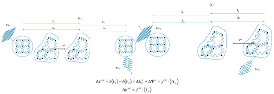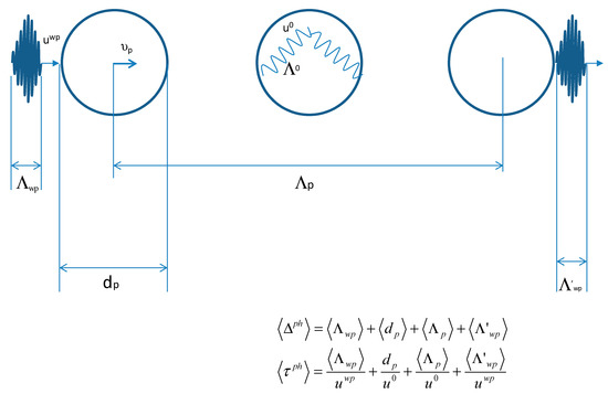 Figure 2 is a close-up of the first part of the “wave-packet ↔ liquid particle” interaction shown in Figure 1a, during which the phonon transfers energy and momentum to the liquid particle. <Λwp> is the extension of the wave packet and <dp> is that of the liquid particle. Once <τp> has elapsed and the liquid particle has travelled by <Λp>, the particle relaxes the energy stored into internal DoF; then, it travels by <ΛR> during <τR> (not shown in the Figure) [17].