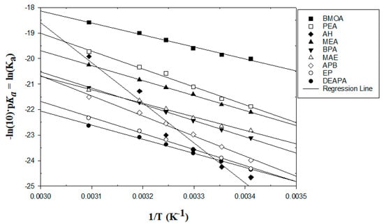 Linear relationship between the first dissociation constants and inverse temperatures of the amines studied.
