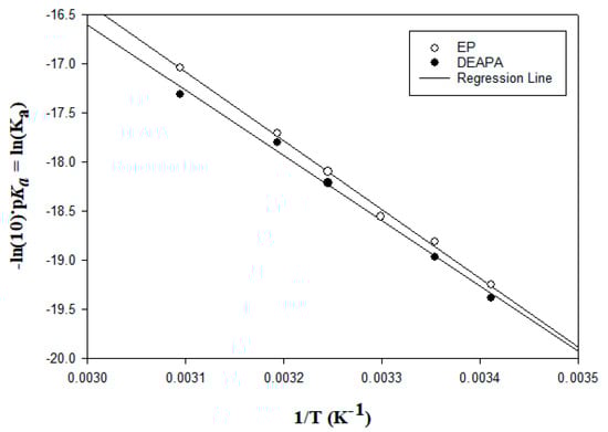 The standard state enthalpy change (ΔH0, kJ·mol−1) and entropy change (ΔS0, kJ·mol−1·K−1) can be determined using the van’t Hoff equation [9,10,15]. These thermodynamic quantities (ΔH0 and ΔS0) can be regressed using data in Tables S4 and S5 and Figure 1 and Figure 2 by applying Equation (7). In the equation, the slope and intercept of the linear regressions are () and (), respectively. The universal gas constant (R, kJ·mol−1·K−1) value is 8.3145 × 10−3 kJ·mol−1·K−1. In addition, the standard state free energy of the reaction (ΔG0, kJ·mol−1) was calculated using Equation (8). The calculated values of these thermodynamic quantities are reported in Table 2, Table 3, Table 4 and Table 5.