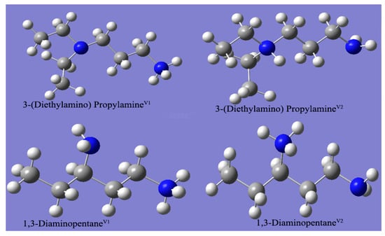 Based on the results reported in Table 6, the differences in PES (ΔE/ kJ·mol−1) were positive for all calculation methods for 3-(Diethylamino) propylamine. This means that the E1 was higher than E2 or the protonated tertiary amino group was more stable than the protonated primary amino group in the structure. The results do not agree with what is reported in the literature [9,10,16], which suggested that the primary amino group should be protonated before the tertiary amino group. However, the functional groups in the structure can strongly affect the order of protonation for the amines. This conclusion will be studied further in the later parts of this study. As for 1,3-Diaminopentane, the differences were all negative; this implies that the protonated amino group on the chain structure was more stable than the protonated amino group on the branch.
