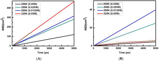 The present study is aimed to investigate the distribution of water molecules around the phosphate anions at various temperatures and phosphate ion concentrations. Atoms in liquids are subject to a deviation from their average coordinates at any particular temperature, i.e., liquid particles move constantly. Although the displacement is very important, the trajectory followed by liquid particles resembles a random walker. Mean square displacement (MSD) is a better quantity than displacement to measure the liquid particles’ motion. MSD measures the deviation or “thermal” displacement of the coordinate of a particle for a reference coordinate over time. The MSD of a particle at time t is defined as:
