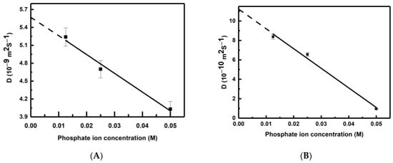 Variation of self-diffusion coefficient (D) of (A) water and (B) phosphate with concentration at 298 K. Error bars (within ±1.5%) are also shown.