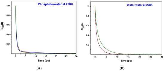 The variations of the CHB(t) functions are also shown in Figure 3. The CHB(t) functions are fitted excellently with multi-exponential decay (χ2~10−4 and R > 0.99), and the fitting parameters, e.g., amplitude, time constants and average lifetime of HB bonds for water–water and phosphate–water are provided in Table 2. All the HB correlation functions show tri-exponential decay except for the correlation function at 0.0125 M and 298 K, which shows bi-exponential decay. The information on the fitting parameters of HB time correlation functions helps to comprehend the hydration process very effectively in polarizable and non-polarizable water mediums [,,,,,].