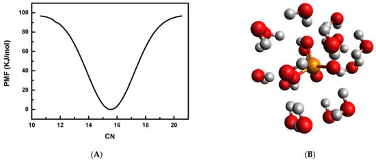 (A) Plot of potential of mean force, PMF in kJ/mol by employing water CN as a CV in WT-MtD simulation at 298 K. (B) Most stable structure of PO43−·16H2O cluster.