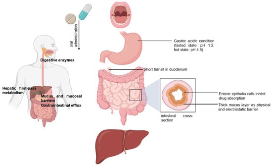 Peroral is the most common delivery route for drug administration [1,2,3]. Oral dosing is the most preferred by patients and convenient to handle for healthcare providers because taking medicines by mouth is non-invasive and requires no sterility constraints compared to injectables [2,3,4]. However, an orally administered drug formulation must survive the gastrointestinal tract’s harsh environment, gastric acidic conditions (pH 1.2), the presence of digestive enzymes, the mucus and mucosal barriers, the enteric epithelia whose tissue morphology inhibits drug absorption, and the hepatic metabolism for local and/or systemic therapy (Figure 1) [1,2,3,4,5]. Notably, hepatic first-pass metabolism, also known as drug pre-systemic exposure, heavily reduces the pharmacokinetic effects of drugs [2,4,5]. Thus, the oral bioavailability of many small molecule active pharmaceutical ingredients (API) (of biopharmaceutical classification system (BCS) III (high solubilitypoor permeability) and IV (poor solubilitypoor permeability) drug classes) is often very poor, and the oral delivery of biologics remains a great challenge [2,5].
