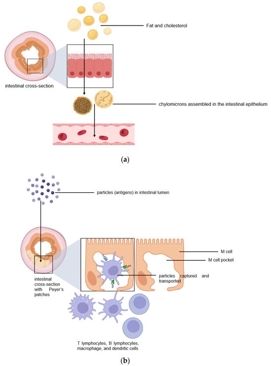 The intestinal lymphatic pathway can be considered as the ultimate solution for drug transport to avoid first-pass metabolism [1,2,5,6,7]. The intestine absorbs fat both through passive diffusion and protein-facilitated transfer [2,5,6,7,8]. The exogenous lipoprotein pathway utilizing chylomicronsthe fat carriers assembled in the intestinal epithelium, is responsible for transferring the food-derived lipids and fat-soluble vitamins to the cells [5,6,7,8]. Therefore, by targeting the chylomicrons in enterocytes, lipid-based drug formulations can be absorbed from the intestine via lymphatic transport through the chylomicron pathway, and they enter the bloodstream through the thoracic lymph duct (Figure 2a). Another promising lymphatic pathway for oral drug delivery is the microfold cells (M cells) channel [5,7,9]. The epithelium covering mucosa-associated lymphoid tissues is where M cells are typically found. In the ileum, M cells mediate the interface between the lumen and the lymphatic system by capturing and transporting pathogen-like particles. To initiate an immune response, M cells actively deliver luminal particles and antigens to intestinal dendritic cell subsets lying under lymphoid follicles (Figure 2b). The lymphatic vessels are closely associated with blood vessels, and they are well-distributed throughout the intestinal wall and lined with endothelial cells that are highly permeable to lipophilic molecules. Herein, we discuss several studies that have engineered drug delivery vehicles so that lymphatic vessels and immune cells in the intestines can absorb them more efficiently.