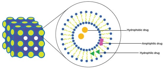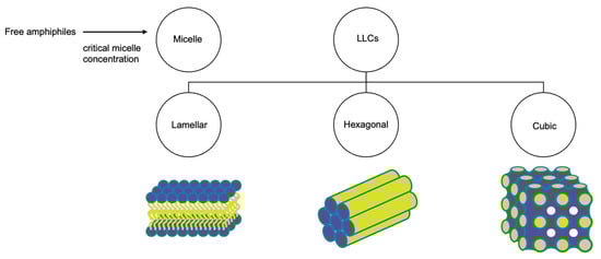 Lyotropic liquid crystals (LLCs) result when amphiphiles (amphiphilic mesogens) dissolve into suitable solvent-forming solutions that flow like liquids but still have ordered crystalline structures of solid crystals [10,11]. The well-defined, thermodynamically stable structures of LLCs such as lamellar, hexagonal, and cubic (Figure 3 and Figure 4) are formed by the self-assembly of amphiphilic lipids due to hydrophobic forces. By dispersing these mesophase structures into water in the presence of stabilizers, they can be transformed into liposomes, hexosomes, and cubosomes, collectively known as LLC drug delivery systems [11]. In recent years, due to their unique structures offering matrices for prolonged drug release as well as their amphipathic nature for the encapsulation of hydrophobic, amphiphilic, and hydrophilic molecules of various molecular weights, LLC drug delivery systems have drawn significant attention as one of the advanced systems in the field of colloidal dispersions [11,12,13]. Figure 4 shows how a hydrophobic drug, a hydrophilic drug, and an amphiphilic drug are encapsulated in cubosomes. Many lipids that form LLCs are biocompatible and biodegradable and are applicable to the oral route of administration [12,14]. Intestinal lymphatic absorption is a pathway that an LLC drug delivery system may follow to gain access to the systemic circulation after its oral administration. A lipid-based LLC drug delivery system targeting the intestine can enhance intestinal lipid fluidity.