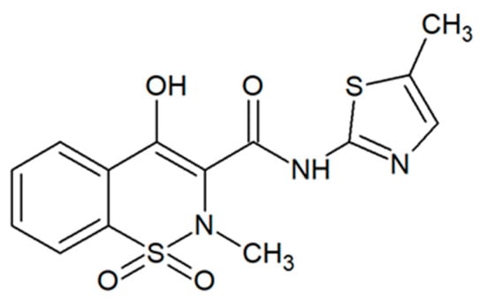 Meloxicam (the molecular structure is shown in Figure 1; IUPAC name: 4-hydroxy-2-methyl-N-(5-methyl-2-thiazolyl)-2H-1,2-benzothiazine-3-carboxamide-1,1-dioxide; molar mass 351.40 g·mol−1; CAS number: 71125-38-7; PubChem CID: 54677470) is a non-steroidal anti-inflammatory drug commonly used for pain and inflammatory treatments, particularly in rheumatic diseases and osteoarthritis. Regarding its action mechanism as an anti-inflammatory drug, it blocks cyclooxygenase-2 more than cyclooxygenase-1, which makes it more specific than other drugs [1,2,3,4,5].