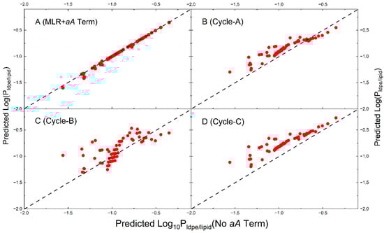 The Abraham solvation model, Equation (1), is used to construct the LDPE-lipid partition constants () in this study. This is performed in two ways, as described in Section 2.2. The first is by MLR with and without the aA term. The regression results and statistics are shown in Table 1. The model without the aA term is called MLR model in Table 1. The second is by the thermodynamic cycle conversion using the system constants of and . The results of the conversion are also indicated in Table 1. The models (Systems I, J and K) by thermodynamic cycle conversion are called “Cycle”.