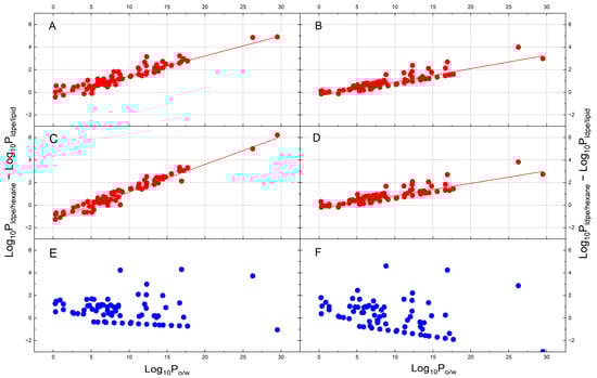 Equation (5) indicates that can have the same reference phase, water, with in principle and a linear relationship between and should be expected fundamentally, although they are derived differently. The correlation of was derived by the partition systems of LDPE-methanol and heptane-methanol [33]. The are derived from MLR and thermodynamic cycle conversion in this study. If a linear relationship could be established between and , the constructed models for and are confirmed to be correct and suitable to predict LDPE-lipid and LDPE-hexane distributions. See Section 4.4 for more details.