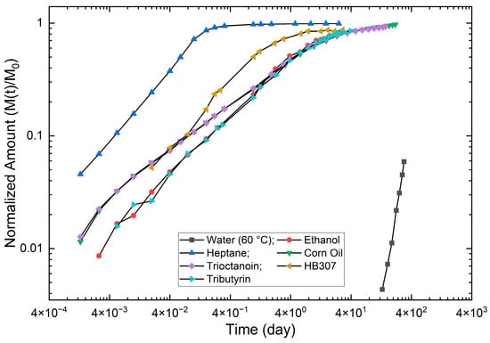 Regarding the extraction of nonpolar (device) materials by alkanes (e.g., hexane) and lipids, the release kinetics of extractions of polyolefins by alkanes is usually faster than that by lipids (or vegetable oils), because alkane solvents cause a significant swelling of nonpolar materials, and enhance the diffusion rate of material constituents [20,22]. The interactions between lipids and polyolefins are much weaker due to the high MW of lipids/oils [34]. Because of the difference in release kinetics, a much shorter extraction time and lower temperature of alkanes have been evaluated and used to establish the equivalence between alkane and lipid extraction, so that the same amount of extractables by oils can be predicted by alkanes in food industries [13,16,35,36,37,38]. For example, 10 days and 40 °C olive oil extraction on polyolefins can be replaced by 2 days and 20 °C extraction with isooctane [28]. In fact, the FDA guidelines to correct for the accelerating action of n-heptane over food oils is by 5-fold [20].