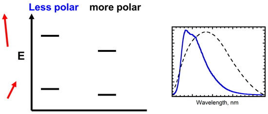 The structural features that lend themselves to solvatochromism include extended π systems. Second, molecules that respond to solvent polarity typically have large dipole moments and, more precisely, a large difference between the ground and excited state dipole moments. Structurally, this translates to uneven distribution of electrons in the molecule, usually facilitated by the presence of polar groups, more specifically, electron donating and electron withdrawing groups separated by an extended system of conjugation through which electrons can easily travel via push–pull or intramolecular charge transfer (ICT) behavior [22]. If a more polar solvent stabilizes the probe in its excited state (larger probe dipole moment) to a greater extent than it stabilizes the ground state (smaller probe dipole moment), positive solvatochromism results [23]. This is exhibited as a red (bathochromic) shift in optical spectra (Figure 2). If, instead, a more polar solvent stabilizes the ground state of the probe more than the excited state, negative solvatochromism results (not shown). In this case, the transition is of higher energy and the optical spectrum exhibits a blue or hypsochromic shift [23].