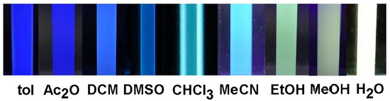 The quickest and most entertaining way to assess the solvatochromism of a probe is to observe solutions in various solvents under a UV lamp (Figure 4). Solvatochromism is usually formally assessed by measuring the Stokes shift, that is, the difference in wavenumbers between the excitation and emission maxima (), in a range of solvents of differing polarity. The absorbance (or excitation) maximum of a probe can sometimes respond to solvent polarity, but in general, emission peak maxima are more sensitive to this property.