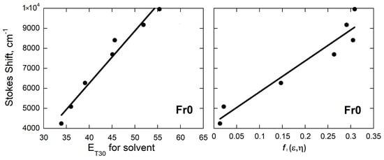 Lippert–Mataga (left) and ET30 (right) plot for the solvatochromic dye Fr0. Plots were generated with data obtained from Ref. [44] as described in Section 2.