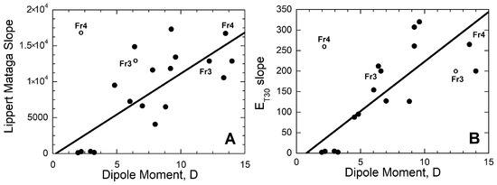 In an initial computation on Fr3, with no attention to conformation, the ground state dipole moment was 6.37 D, which led to an outlying point (open circle in Figure 6). However, exploring a different orientation for the heterocyclic ring and the rest of the sidechain yielded a higher dipole moment (12.23 D) that aligns better with the other correlated data. A similar pattern was observed for Fr4 and alternate conformations.
