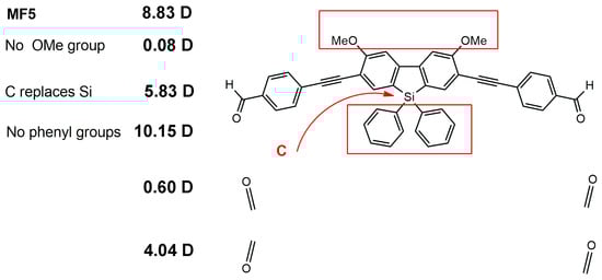 This general structure also provides a wealth of opportunities for exploring the design of solvatochromic probes, and DFT is especially useful in exploring structure space without committing resources for synthesis. As an example, a structure–dipole moment relationship exploration was conducted via DFT calculations on a series of MFs related to MF5. As summarized in Figure 9, the methoxy groups are absolutely critical to the magnitude of the dipole moment; substituting the central atom with C decreased the dipole moment, while removing the phenyl groups increased it. Thus, even within the fluorene core there are opportunities to increase the dipole moment and hence solvatochromism.
