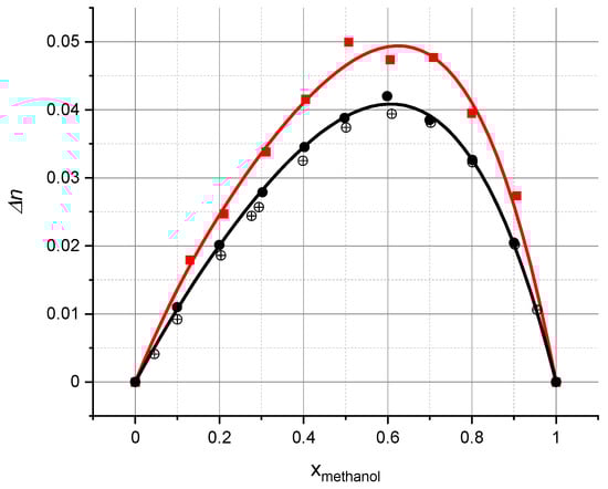 Furthermore, Iglesias et al. [25] attribute this inversion to the increased dipoles and dispersion effects in a smaller unit volume affecting the passage of light through the medium. Moreover, as Δn for methanol–anisole mixtures is larger—more positive than Δn for methanol–toluene—the VE observed for methanol–anisole mixtures should be larger than VE in methanol–toluene mixtures. This is observed in Figure 2. It should be noted that anisole has a larger dipole moment compared to toluene and a larger mass, which is associated with increased dispersion effects suggesting the deviation from ideality should be larger in anisole mixtures than in toluene mixtures.