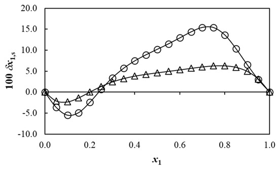 In this way, the D values shown in Table 8 and Table 9 were calculated from the first derivative of Equation (23) by considering the variation of aqueous cosolvent mixture composition in incremental x1 = 0.05 steps for all the mixture composition intervals. The required Q, RT·κT, and values corresponding to {ethanol (1) + water (2)} and {propylene glycol (1) + water (2)} mixtures were taken from the literature [31]. Because values are not available for phenothiazine in these {cosolvent (1) + water (2)} mixtures, they were considered as those calculated based on the Fedors’ method, i.e., 137.3 cm3·mol−1, as shown in Table 6 [27].