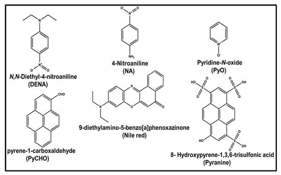 Hydrated metal salts [lanthanum nitrate hexahydrate (La), cerium nitrate hexahydrate (Ce), and gadolinium nitrate hexahydrate (Gd)] and urea were chosen as the DES constituents and were obtained with the highest purity ≥ 99% from Sigma-Aldrich and SRL Enterprises, respectively. N,N-Diethyl-4-nitroaniline (DENA) and 4-nitroaniline (NA) (Figure 1) were used as absorbance probes in this work. DENA and NA were obtained from Frinton Laboratories and Spectrochem Co. Ltd.(Hainesport, NJ, USA), respectively, while Pyridin-N-oxide (PyO, 95%), Pyrene-1-carboxyldhyed (PyCHO, 99%), 9-diethylamino-5-benzo[a]phenoxazinone (Nile red, ≥98%, HPLC), and 8-hydroxypyrene-1,3,6-trisulfonic acid (pyranine, 99%) (Figure 1) were purchased from Sigma-Aldrich (St. Louis, MO, USA). These were used without any further purification.