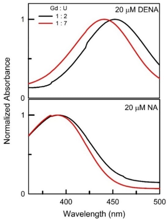 Representative absorbance spectra of 20 ± 2 μM DENA and 20 ± 2 μM NA within DESs (Gd : U) at 1 : 2 and 1 : 7 molar ratios.