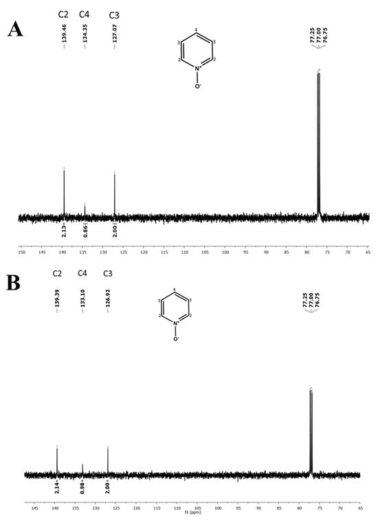 Representative 13C NMR spectra of 250 ± 5 mM PyO within DESs (La : U) at 1 : 3 (A) and 1 : 7 (B) molar ratios.
