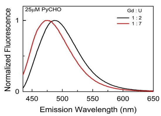 Representative emission spectra of 25 ± 2 μM PyCHO ( within DESs (Gd : U) at 1 : 2 and 1 : 7 molar ratios.