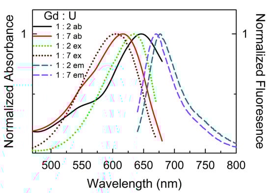 Representative absorbance (ab, 10 ± 1 μM), excitation (ex, 25 ± 2 μM), and emission (em, 25 ± 2 μM) spectra of Nile red dissolved in DESs (Gd : U) at 1 : 2 and 1 : 7 molar ratios.
