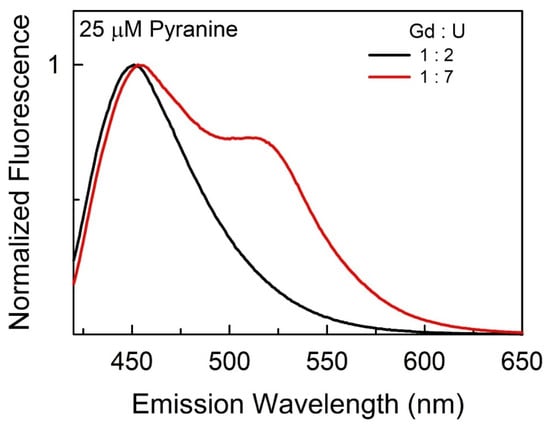 Representative emission spectra of 25 ± 2 μM pyranine ( dissolved in DESs (Gd : U) at 1 : 2 and 1 : 7 molar ratios.