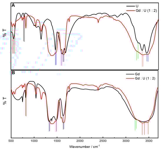 FTIR absorbance spectra of urea (U, panel A), Gd(NO3)3.6H2O (Gd, panel B), and DES (Gd : U :: at 1 : 2) (panels A and B), respectively, under ambient conditions. Vertical lines represent shift in maxima when going from neat constituent to DES.