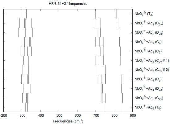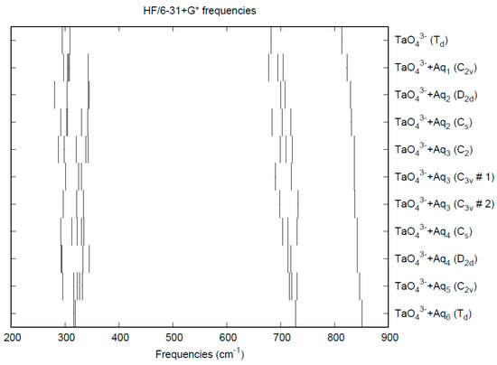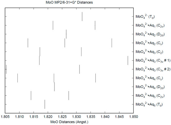 The effect of water upon the Mo-O distances (MP2/6-31+G(d)) in MoO42−•nH2O (n = 0–6) is given in Figure 11. The net effect is a moderate shortening of the Mo-O distance by 0.013 Å (n = 6). The individual Mo-O distances vary by up to 0.025 Å (in chromate, the variation was larger at 0.05 Å). The Mo…O distance is about 0.1 Å larger/smaller than the corresponding distance in the hydrated chromate/pertechnetate (Figure S11), although there is less variation within a particular species. For the O…H and O…O distances, the increase of about 0.1 Å upon going from mono to hexahydrate is much similar to chromate, although the spread within a species is about half (Figures S12 and S13). In 2M sodium molybdate solution, the Mo-O (Mo…O) distance was found to be 1.786(8) (4.06(2)) Å by LAXS [112]. The vibrational frequencies (HF/6-31+G*) as a function of hydration number are shown in Figure 12. The frequencies are lower than in pertechnetate and chromate. The effect of hydration is similar to that in chromate, except that the splitting within degenerate modes is somewhat smaller. The splitting is still large enough to obfuscate the correlation between the two deformation modes because of the overlap. In an aqueous solution, the Mo-O distance is 1.775(4) Å by LAXS, and the Mo…O distance is 4.010(3) Å [48]. While the Mo-O distance is well-reproduced by the calculations, the Mo…O distance is too short in the hexahydrate. This is rectified in the dodecahydrate model, in which the Mo…O distance lies in the range of 3.82–3.94 Å, depending on the level of theory.