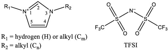 Structures of cations (HCnIm and CnCmIm) and anion (TFSI) of the studied ILs.