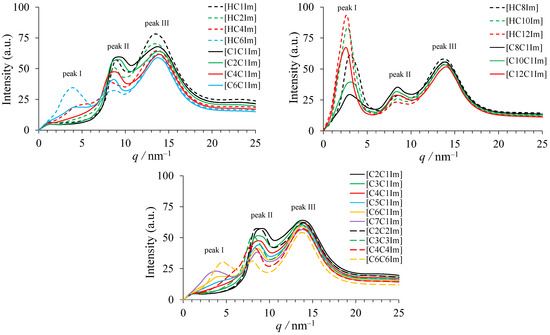 X-ray scattering curves calculated from the MD trajectory snapshots are presented in Figure 2. As in experiments [6,7,8,12], up to three peaks are observed in these curves. Peak I corresponds to the smallest values of q and characterizes the separation distance between charged groups by the alkyl chain, i.e., the size of apolar domains. Its intensity and position depend on the length of the alkyl substituent. Peak I can appear as a shoulder in the case of short alkyl chains and is unnoticeable for substituents with fewer than four carbon atoms. Peak II observed around 9 nm−1 was reported [54] to describe the distance between polar groups of the same charge not separated by alkyl chains. The positions of the maxima of peaks I and II for calculated and experimental scattering curves are given in Table 2. Peak III is positioned near 14 nm−1 and is caused by ions located at close distances (about 0.45 nm). Its position and intensity are almost the same for different bistriflimides except for protic 1-methyl and 1-ethylimidazolium salts showing slightly lower q values of the peak maximum, in agreement with experimental observations [6,7].