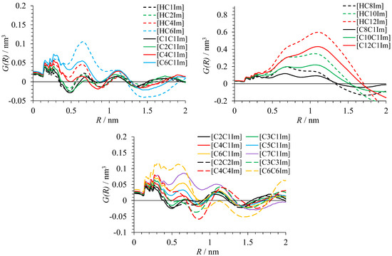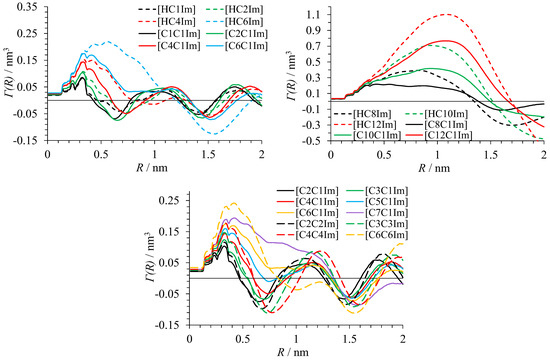 As stated above, RDF integrals G(R) and , and local density fluctuations can be calculated separately for the polar and apolar domains. This always resulted in a pair of curves sharing similar features. Most importantly, G(R) and had their first zero, and had its maximum at the close values of radii R for calculations with polar and apolar atoms. The same result was observed in the analysis of the structure of alkylammonium salts [16]. Hence, these functions characterize a general length scale of heterogeneities in ionic liquids. Below, only the results of calculations of G(R) and for the polar domain and for the polar atoms as reference are shown.