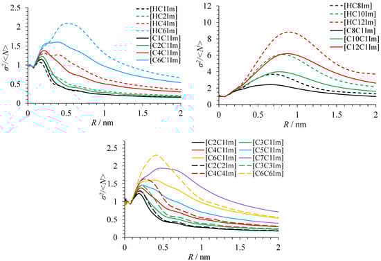 The above conclusions are fully supported by the curves of the variance of atom density shown in Figure 5. C1–C3 liquids have no maximum or even shoulder caused by the difference in the atom density inside and outside domains. Other liquids show signs of nanoheterogeneity. The variance is also larger for protic than for aprotic liquids. Symmetric ionic liquids [CnCnIm][TFSI] exhibit better segregation of polar and apolar domains than asymmetric liquids [CnC1Im][TFSI], which is also visible in the G(R) and curves.