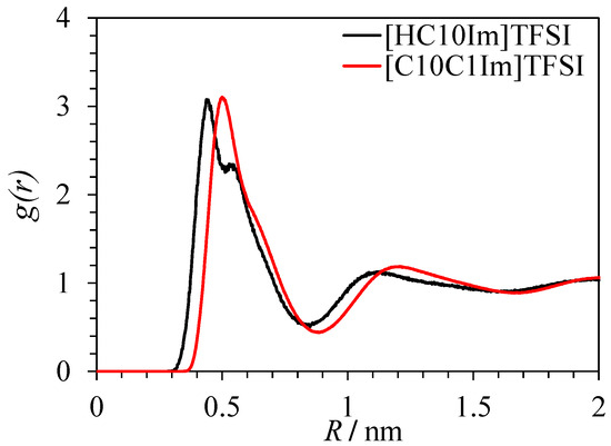 Radial distribution function g(r) between the center of mass of the anion and N3 atom of imidazolium ring for [HC10Im][TFSI] and [C10C1Im][TFSI].