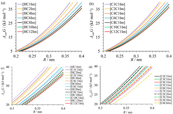 The Gibbs free energy of cavity formation in alkylimidazolium bistriflimides at 298 K for spherical cavities with various radii R: (a,b) dependence on the alkyl substituent chain length; (c) comparison of protic and aprotic ionic liquids; (d) comparison of liquids with symmetrically and asymmetrically alkylated cations.