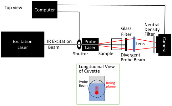 Schematic of the experimental configuration, highlighting the laser system and imaging components. The excitation beam is well collimated and is directed through a shutter, over the probe beam housing, and into the sample until finally it is blocked by a colored-glass filter. The probe laser is set to diverge, such that its beam size is approximately 1 cm in diameter when it reaches the sample. It largely passes through the colored-glass filter. A focusing lens reduces the size of the beam, such that it fits across the camera’s sensor chip. The green outline box shows a longitudinal view of the sample cuvette. The black dashed circle represents the viewing field of the probe beam. The blue represents the bulk liquid, and the gray represents the air above it. The surface is shown here as flat, but in real samples, there are menisci. The red/pink represents the thermal plume, which is warmer than the surrounding fluid.