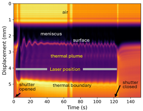 A qualitative conceptual model can be applied that is grounded in the theory of free convective flow near a stagnation point [22] and thermal Marongoni flow [24]. The system is modeled as a two-dimensional system, integrating over the longitudinal dimension. For a liquid–solid surface, the Navier–Stokes equations can be solved exactly [23]. The current scenario differs critically due to the deformable liquid–air interface. As the rising thermal plume reaches this interface, it encounters a stagnation point where the vertical velocity component must ultimately turn horizontally, but not until the surface deforms. The surface tension-induced restoring force of the deformable interface, crucial for the experimentally observed behavior, likely precludes an analytic solution to the Navier–Stokes equations for this system. Consequently, the current authors offer this qualitative model as a framework for interpretation [21].