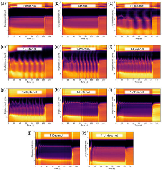 Heatmap representations of the video data for the straight-chain alcohols (ordered from methanol through 1-undecanol as (a–k) and colored such that dark indicates low signal intensity and light (yellow) represents high signal intensity). Methanol and ethanol exhibit rapid transient responses before the surface reaches a new equilibrium position. The same is true for 1-decanol and 1-undecanol, although their transient responses are slower. The remaining alcohols exhibit steady-state oscillation. For the cases of 1-propanol through 1-pentanol, there is a period of irregular oscillation and a period of stable steady-state oscillation [21]. 1-hexanol and 1-hepanol show only irregular oscillation. 1-octanol undergoes a transient response that transitions into a frequency-doubled steady-state oscillation. The steady-state oscillation in 1-nonanol is nearly unnoticeable. In addition to surface oscillation, there is an oscillation of the thermal boundary layer, suggesting a resistance to mechanical thermal mixing.