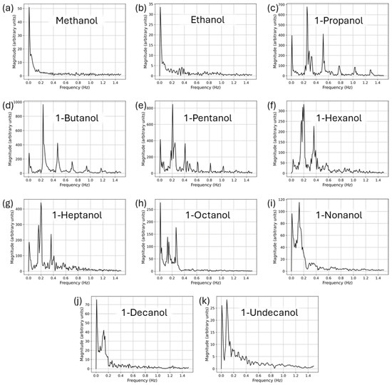 Fourier transforms of the surface displacement versus time for the heatmaps shown in Figure 3 (ordered from methanol through 1-undecanol as (a–k)). Methanol and ethanol do not show peaks (aside from a residual DC peak). 1-decanol and 1-undecanol show broad peaks arising from their transient responses. Those alcohols that exhibit steady-state oscillation show more peaks, which appear as overtones of a fundamental peak. This is particularly true for 1-propanol through 1 pentanol, which exhibit stable steady-state oscillation. The spectra for 1-hexanol and 1-hepatanol show weaker overtone peaks, although there remains significant energy in the first overtone. Finally, a sharp first overtone peak appears for 1-octanol. It is the strongest peak aside from a residual DC peak.